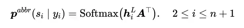 在本文中,我们重点关注缩略词处理的第三个任务,即缩略词预测,其目标是预测实体完整形式的可能缩写形式。缩略词实际上是一个子序列,由一个词或一些字符按完整形式的顺序排列。不同于英文缩略词(通常是首字母缩略词),中文缩略词形式更加复杂多样。