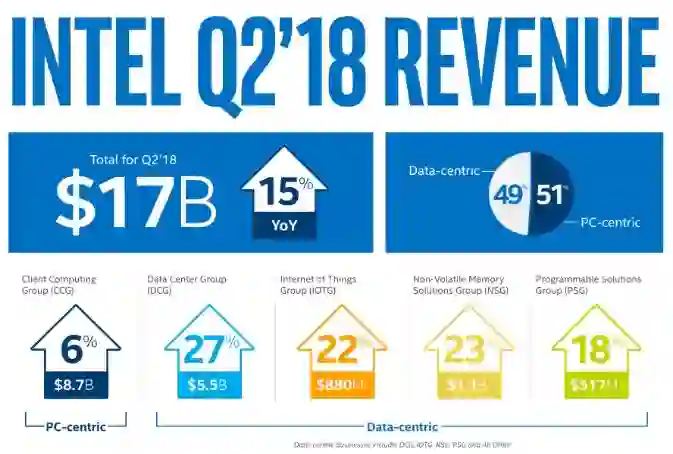 雷锋网消息,芯片霸主英特尔上周迎来了其50岁的生日,昨日英特尔公布了50岁生日后的首份财报。按照美国通用会计准则(GAAP)计算,英特尔2018年第二季度营收为169.62亿美元,较去年的148亿美元同比增长15%,净利润50.06亿美元,同比增长78%。英特尔亮眼的业绩超出此前华尔街的预期,但股价却在财报发布后下跌,这是为什么?