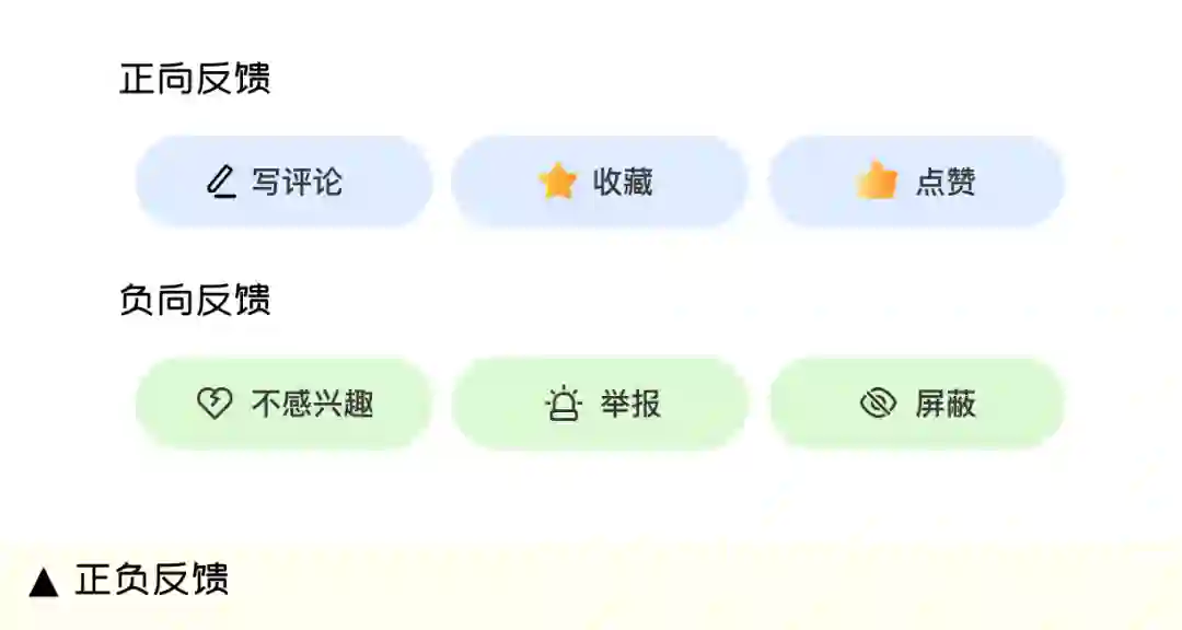 正向反馈是用户的喜好体现,使用场景比较清晰,包括点赞、关注、收藏、评论等行为。而负向反馈属于用户兴趣变化的结果对体现,随着用户喜好的改变在一段时间后,推送内容已经不能满足当前喜好,用户已毫无兴趣,甚至已经厌烦。