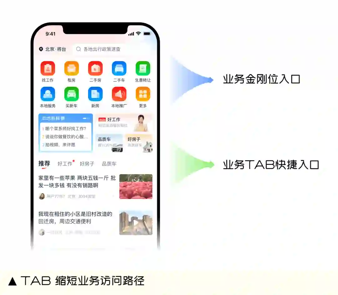 新用户浏览路径较短,不容易接受相对复杂的浏览路径。如果使用深度用户的浏览路径,新用户很难完成复杂操作,极易中断浏览。因此针对新用户通过将路径较深的金刚位二级、三级业务列表,调整在首页一级列表中进行展示,采用简单的Tab横划操作,直接缩短浏览路径。