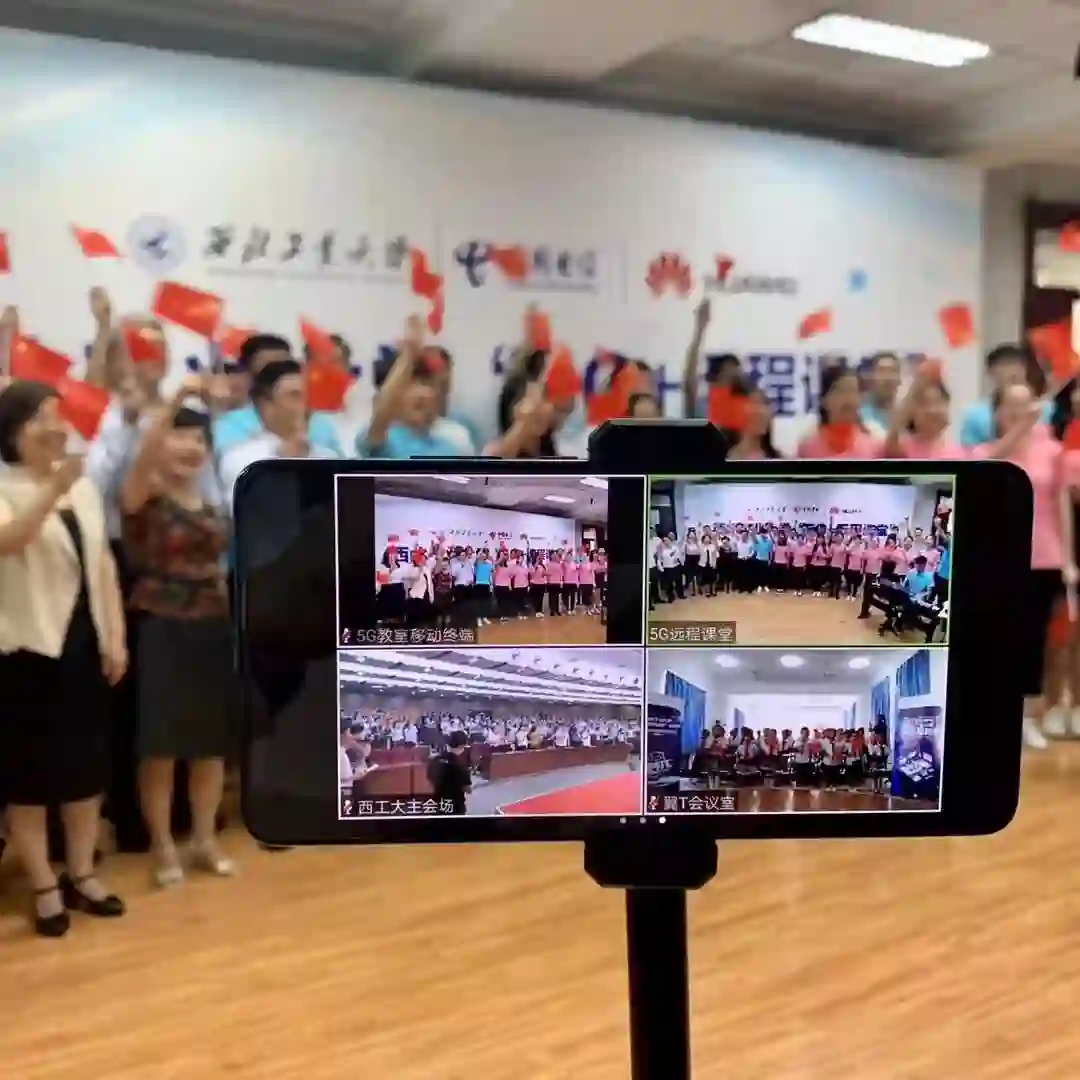 课程最后,全体参会领导和信息化专家与5G教室的大学生、5G创新应用平台团队、渭南市线王小学的孩子们通过5G+高清互动视频会议系统连接,四方同唱《我和我的祖国》,共贺中国共产党建党98周年,喜迎祖国70年华诞。