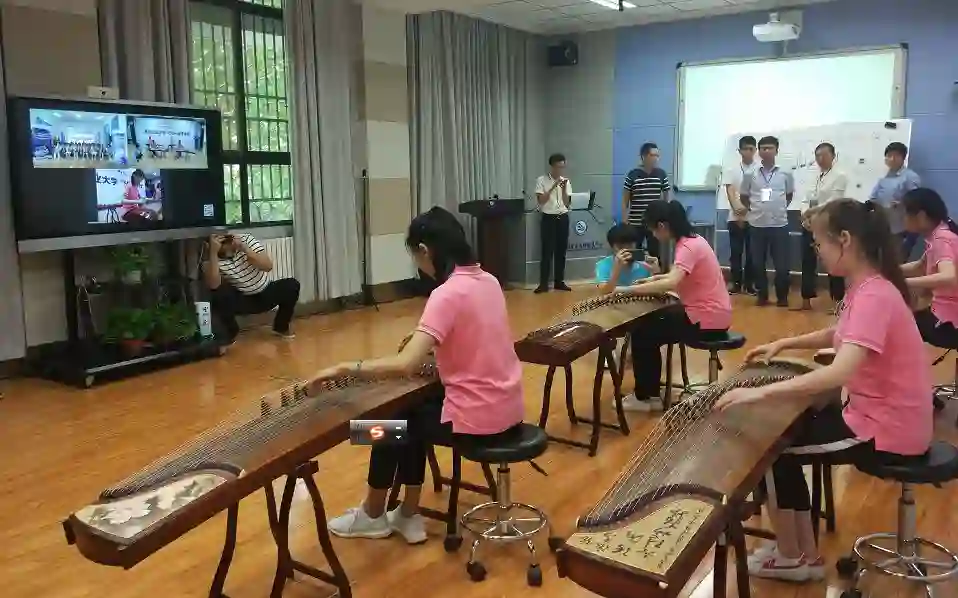 一个小时的课程中,同学们为渭南市线王小学的小朋友们讲解了民族乐器中吹管乐器、拉弦乐器和弹拨乐器的区别,展示了交响乐中弦乐组、管乐组、打击乐组和特色乐器组中的代表乐器,教会了孩子们如何发声、如何演唱。单簧管、小号、大提琴、小提琴纷纷上场,古筝合奏《渔舟唱晚》、扬琴表演《狂想曲》、二胡独奏《赛马》、笛子展示《牧民新歌》、合唱演绎《雪花的快乐》让孩子们听得如痴如醉。5G高速率、低时延的特性让音乐课上的乐器演奏、多重合唱以及异地互动更为及时高效,超越了时间和空间,具有很强的现实感,仿佛彼此近在咫尺。