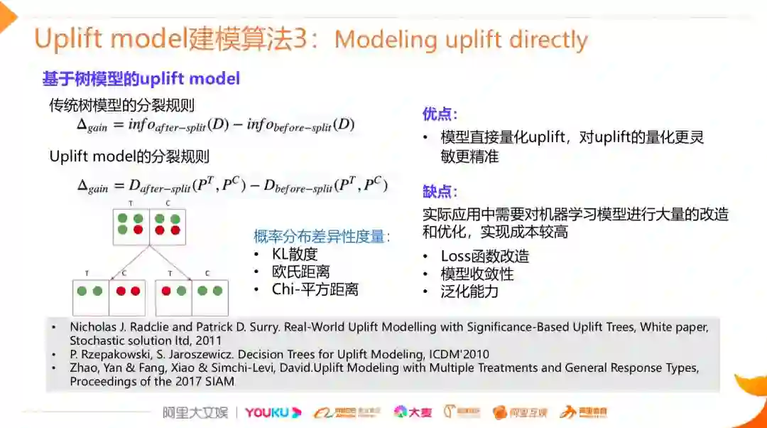 所以后续也有相关研究提出了第三种建模方法,通过对现有的模型内部进行深层次的改造来直接刻画uplift,其中研究较多的是基于树模型的uplift建模,下面主要介绍它的思想,在传统的决策树构建中,最重要的环节是分裂特征的选择,我们常用的指标是信息增益或者信息增益比,其背后的含义还是希望通过特征分裂之后下游节点的正负样本的分布能够更加的悬殊,也就代表类的纯度变得更高。类似的,这种思想也可以引入到Uplift Model的建模过程中,虽然我们并没有用户个体的uplift直接的label,但是我们可以通过treatment组和control组转化率的差异来刻画这个uplift,以图中左下角的图为例,我们有T和C两组样本,绿色的样本代表正样本,红色的代表负样本,可以看到在分裂之前T和C两组正负样本的比例比较接近,但是经过一轮特征分裂之后,T和C组内正负样本的比例发生了较大的变化,左子树中T组全是正样本,C组全是负样本,右子树正好相反,C组的正样本居多,意味着左子树的uplift比右子树的uplift更高,即该特征能够很好的把uplift更高和更低的两群人做一个区分。如何从数学上度量这种概率分布的差异的方式呢?一些文章提出了可行的方法,比如基于KL散度,欧式距离,卡方距离的等等。这种模型的优点是可以直接对uplift进行建模,因此它的精度理论上是更高的,但是在应用层面我们需要做大量的改造和优化,除了前面介绍的分裂规则之外,我们还需要改造它的loss函数,后续的剪枝等一系列的过程,所以它的实现成本是比较高的。