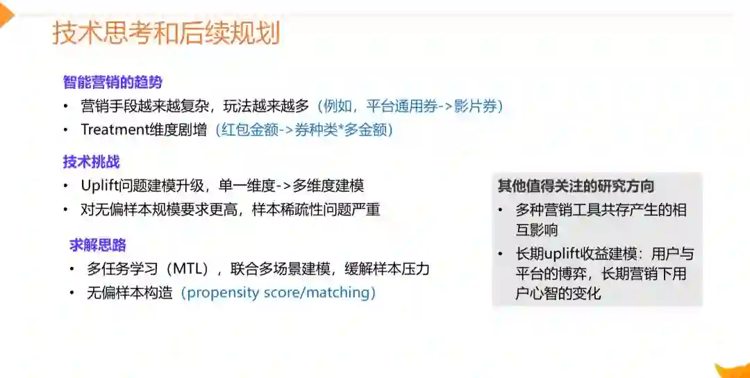 之后智能营销的发展态势是营销手段会越来越复杂,玩法也会越来越多,比如之前我们发放的更多是平台的通用券,后面也会发一些和影片相关的影片券或者影院券,这意味treatment的维度是在不断增长的,除了红包的金额之外还需要考虑不同的红包类型,这会给算法带来两个方面的挑战,一是我们需要对问题的建模形式做一个升级,除了之前单一维度的建模之外,我们可能还要考虑多维度的建模,同时维度的剧增会对样本的量级要求越来越高,样本的稀疏性问题会更加严重,针对这个问题我们有两个可能的解法: