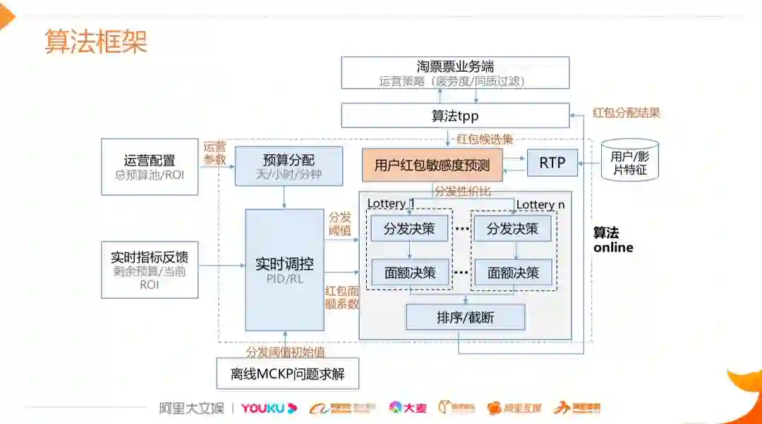 模型在线上应用的框架图,如上图所示,黄色区域是基于uplift model的实时预测的模块,当一条用户的请求过来的时候,我们会实时去数据库中取用户的特征以及影片的特征,同时结合当前的环境特征预测用户在当前状态下真实的敏感度,基于这个敏感度可以进行后续分发的面额决策等。