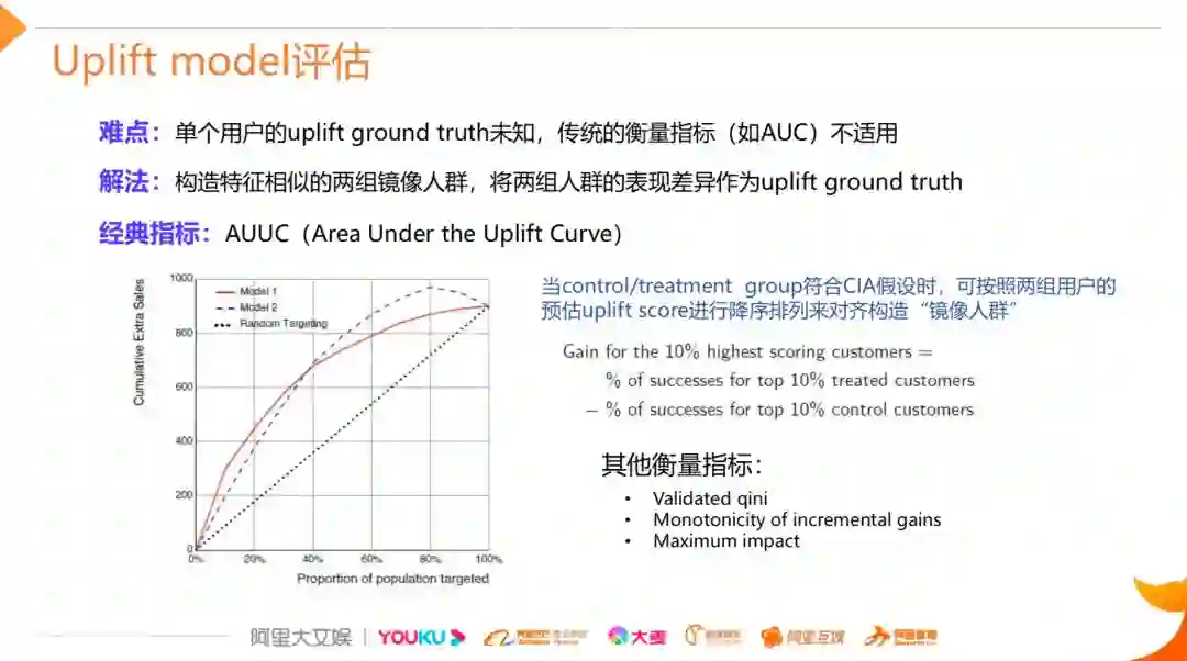 有了以上三种常见uplift的建模方法,我们需要对uplift模型进行评估,因为uplift评估最大的难点在于我们并没有单个用户uplift的ground truth,因此传统的评估指标像AUC是无法直接使用的,解决的一个思路是通过构造镜像人群的方式来间接拿到uplift的ground truth,比如说经典的AUUC的指标就是这样去计算的,假设现在有两个满足CIA条件假设的样本组,我们可以对两群人分别预估他们的uplift score,之后将人群按照uplift score进行降序排列,通过score分数这一桥梁,可以把两组人群进行镜像人群的对齐,之后分别截取分数最高的比如10%的用户出来,计算这一部分人转化率的差异,这个差异就可以近似地认为是分数最高的这群人真实的uplift,类似地,我们可以计算前20%,40%一直到100%的点上面的值,连线就能得到uplift curve。理论上如果模型对uplift的识别比较准确,我们预测uplift比较高的区间段,真实的uplift也较高,uplift curve就会呈现上凸的形式,我们也可以计算曲线下的面积度量不同模型的表现差异。当然除了这种方法之外,还有一些其他的指标如Validated qini等,在此不展开介绍。