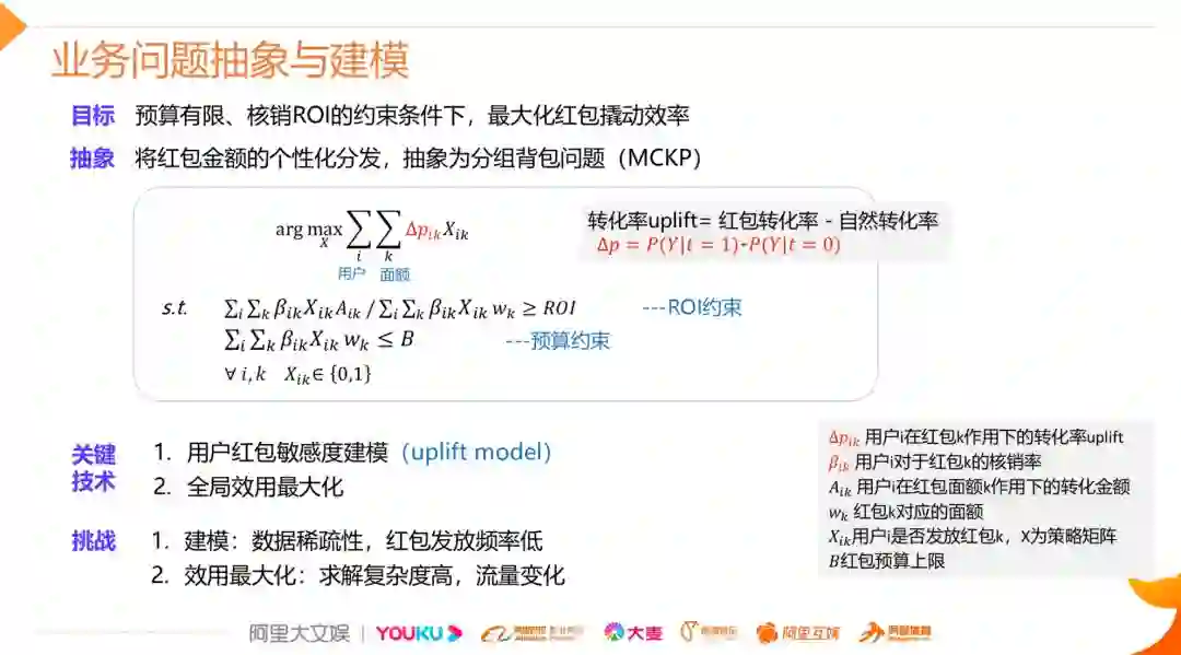 我们以平台通用券为例来说明问题是如何抽象和形式化的。在该场景下,每个用户最多只能发放一个红包,同时面额有固定几个分档,因此问题就精细化到如何对用户进行个性化的面额发放上,这可以通过经典的背包问题来抽象,如图所示,第一个公式是我们的目标,最大化的是红包撬动效率,下面的约束条件一个是ROI约束,一个是预算约束。目标函数公式中标红的部分是第i个用户在第k个红包下转化的uplift,Xik是是否对用户i发放第k个红包,因此我们最终要决策的变量就是X矩阵。