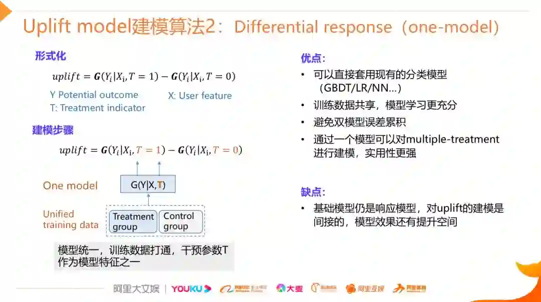 进一步地,还有一个基于One Model的差分响应模型,它和上一个模型最大差别点在于,它在模型层面做了打通,同时底层的样本也是共享的,之所以能实现这种模型层面的打通,是因为我们在样本的维度上做了一个扩展,除了user feature之外,还引入了与treatment相关的变量T ( T如果是0,1的取值可以建模single treatment,T也可以扩展为0到N,建模multiple treatment,比如不同红包的面额,或者不同广告的素材 ),One Model版本和Two Model版本相比最大的优点是训练样本的共享可以使模型学习的更加充分,同时通过模型的学习也可以有效的避免双模型打分误差累积的问题,另外一个优点是从模型的层面可以支持multiple treatment的建模,具有比较强的实用性。同时和Two Model版本类似,它的缺点依然是其在本质上还是在对response建模,因此对uplift的建模还是比较间接,有一定提升的空间。