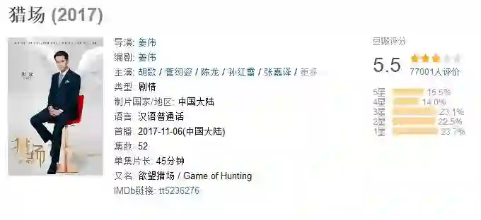 截至12月13日,《猎场》的豆瓣评分为5.5分,共有7700多人参与评分