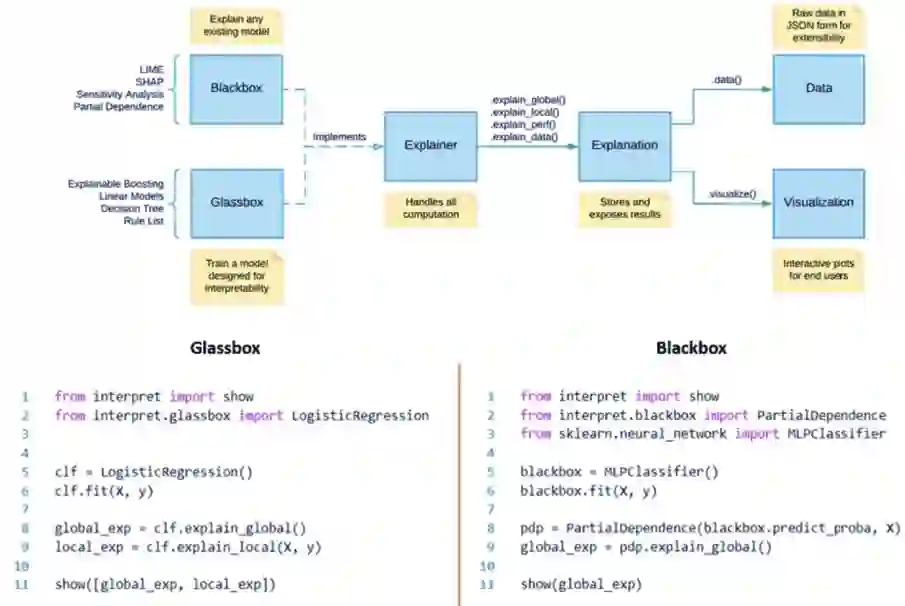 摘要:InterpretML 是一个为实践者和研究者提供机器学习可解释性算法的开源 Python 软件包。InterpretML 能提供以下两种类型的可解释性:(1)明箱(glassbox),这是针对可解释性设计的机器学习模型(比如线性模型、规则列表、广义相加模型);(2)黑箱(blackbox)可解释技术,用于解释已有的系统(比如部分依赖、LIME)。这个软件包可让实践者通过在一个统一的 API 下,借助内置的可扩展可视化平台,使用多种方法来轻松地比较可解释性算法。InterpretML 也包含了可解释 Boosting 机(Explanable Boosting Machine,EBM)的首个实现,这是一种强大的可解释明箱模型,可以做到与许多黑箱模型同等准确的性能。