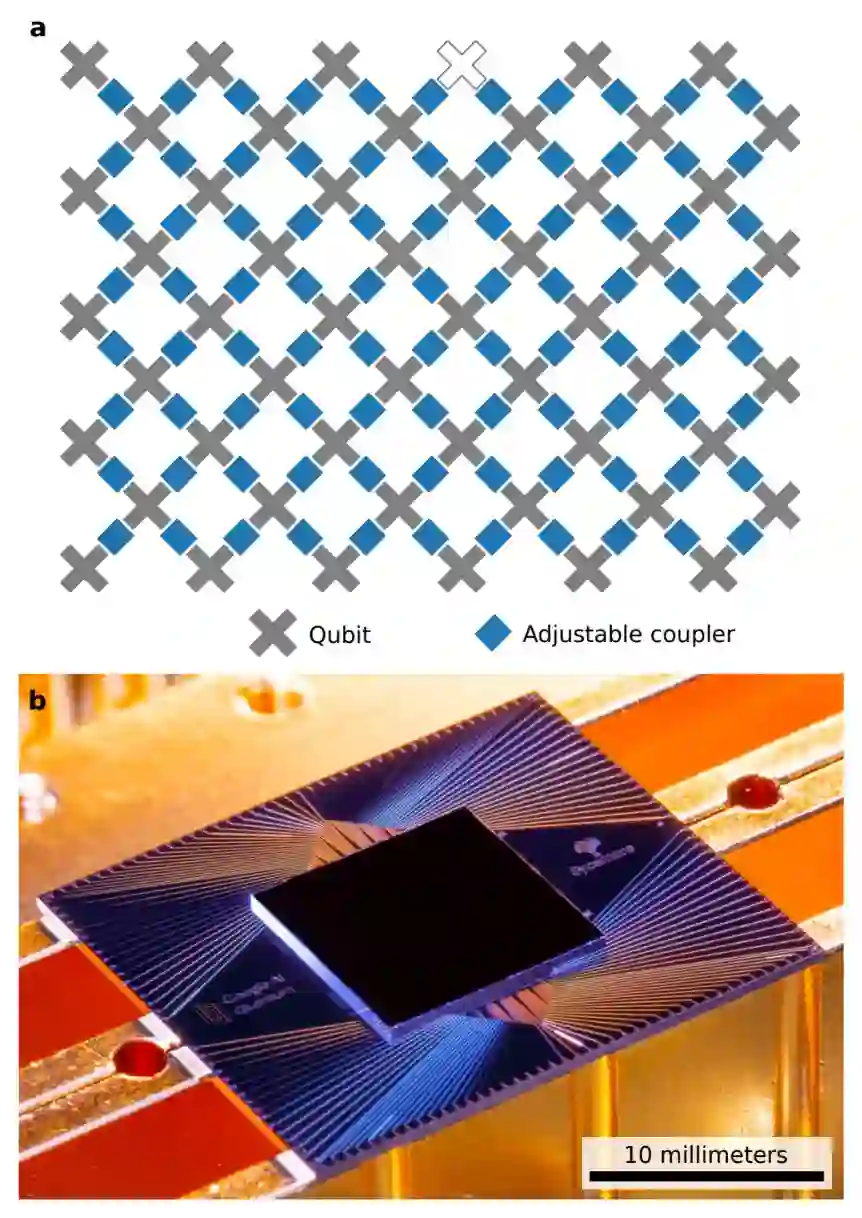 图 1:Sycamore 量子处理器。a. 该处理器的布局,有 54 个量子比特,每个量子比特用耦合器(蓝色)与四个最近的量子比特相连;b. Sycamore 芯片的光学图像。