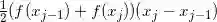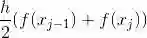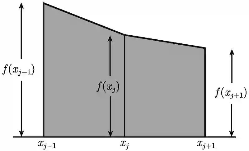 由于有两条边是平行的, 故该条纹是一个梯形. 底边长是 (xj - xj-1) 单位, 而平行的边的高度为 f (xj-1) 单位和 f (xj) 单位. 根据梯形面积公式, 这个梯形条纹的面积是