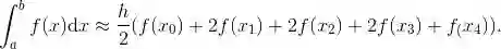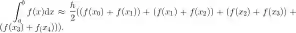 这意味着, 我们可以将很多项合并. 特别地, 除了 x0 和 xn 之外, 形如 f (xj) 的每一项都被用到两次. 例如 n = 4 时, 我们有