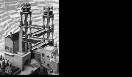 在这副作品中,水流从瀑布的顶峰顺流而下,随着湍急的河流不断前行,然后竟然又回到了瀑布顶端。