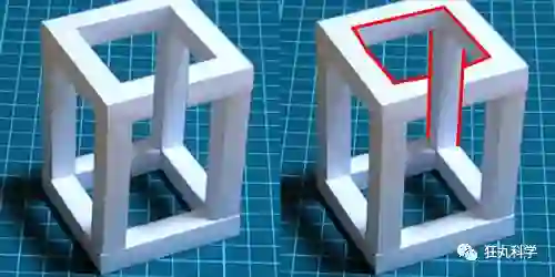 而埃舍尔正是利用了这种模糊性,并将其放大,实打实的创作出了一个「违规操作」的立方体。