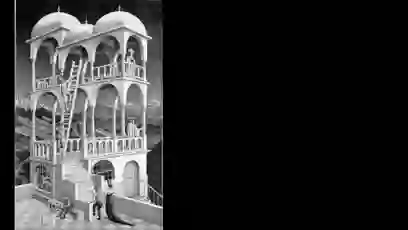 这个奇葩方块同样出自埃舍尔之手,原作名叫Belvedere,在画面的角落里,一位若有所思的青年手中拿着一个违反几何规则的方块。