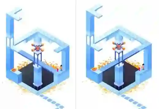 下图就是游戏中的名场面,原本并不在一个平面的路线,却在建筑转换位置后,变成了三角建筑,提供了达到终点的道路: