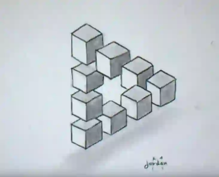 其实这种看似简单的三角构造,可以追溯到1934年。瑞典艺术家奥斯卡是世界上第一个刻意去创造不可能物体的人,其中最知名的作品就是这个由多个立方体构成的大三角。