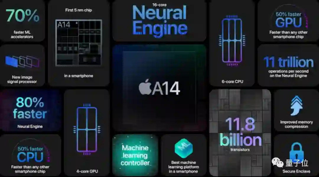 处理器方面,四款手机均采用了上个月刚发布的,全球首款5nm芯片A14 Bionic——集成118亿个晶体管,6核CPU、4核GPU、16核神经网络引擎。