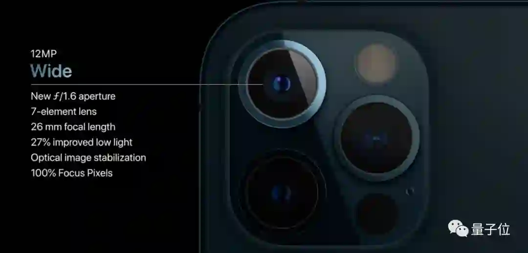 摄像头方面,iPhone 12 Pro是三摄(广角、超广角、长焦)+LiDAR,全新 7P 镜片的广角,f/1.6,52mm 焦距长焦,整套系统可提供四倍光学变焦。