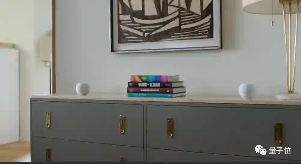 多个HomePod迷你扬声器还可以同步播放音乐,并且放在同一房间时,可以“智能”地创建立体声配对,像这样,一边放一个就行: