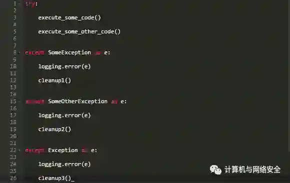 审查应用程序,确保适当的异常处理和日志记录。具体地说,寻找try/except子句,并确保捕获的异常记录在日志中和得到适当的处理。在Python中一个常见的模式是使用如下所示的try/except子句: