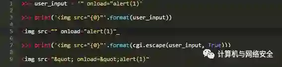 下面一个例子展示了将双引号替换的理由。在第一个打印语句中用户输入增加了一个新的属性,在第二个将引号替换防止用户输入插入一个新的属性。