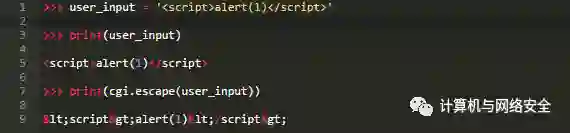 这个程序没有使用模板语言,因此需要在所有文件中查找使用cgi模块的文件,确保所有用户提供的输入都会使用cgi.escape()写回浏览器。cgi.escape()会将<,>,和&替换成HTML中的对应的符号。cgi.escape()的第一个参数是需要转换的字符串。第二个参数默认值为False,可以用来判断是否将双引号也进行转换。如果用户输入将在内部属性中使用,那么双引号也应该被转换。