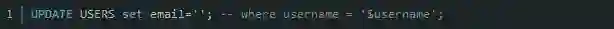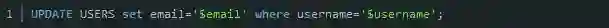 很明显,这段代码存在SQL注入漏洞,但它本身并不能对系统造成什么影响(仅是泄露数据),所以我们案例中的新手渗透工程师可以大胆地随意注入’ or 1=1 --。但如果是下面这段查询代码呢?这段代码用于更新用户的电子邮箱: