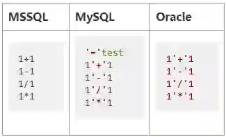 再来看看一些其他办法。MySQL和Oracle都允许对数字字符串进行算术运算。对于MSSQL,如果某个注入点不是字符串,而是整数值,则可以直接注入数字进行算术运算。