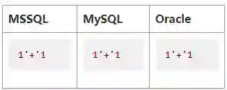 如之前所述,在MSSQL中“+”运算符被用于串联字符串和加法运算,而在 MySQL和Oracle中它只被用于加法运算。也就是说,在MSSQL中,表达式‘1’+‘1’ 会被评估为‘11’,而在MySQL和Oracle中它则会被评估为‘2’。所以,以下载荷便可通用于测试全三种数据库系统: