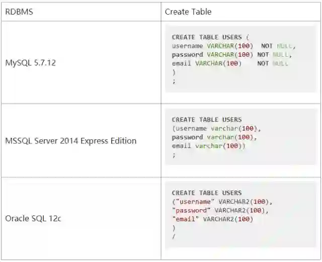让我们来重现一下常见的数据库环境,来测试我们的注入。我们先安装三款企业常用的关系数据库管理系统(RDBMS),MySQL、MSSQL、和Oracle,并在它们中各创建一个储存用户的表(USERS),如下。