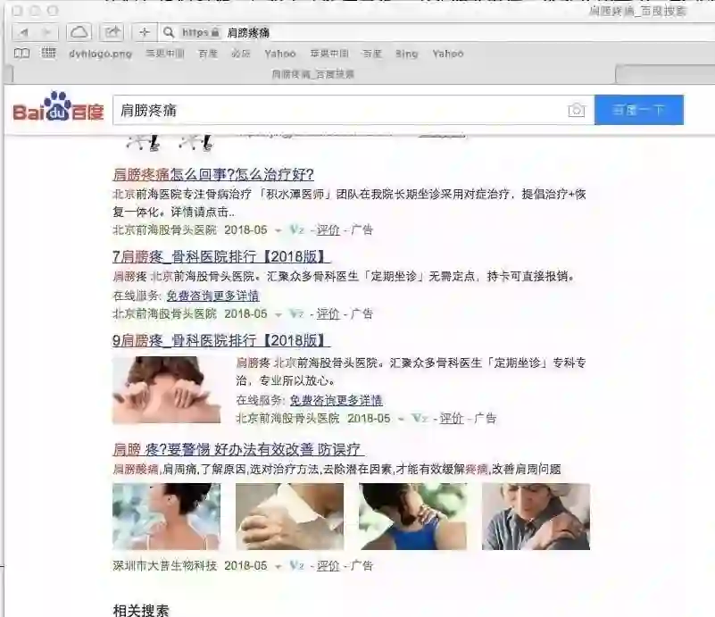 新京报记者5月17日通过百度搜索“肩膀疼痛”,在首页搜索中,前两项搜索结果均为推广内容,分别为来自某民营医院和生物科技公司的推广,且标有“广告”字样。以“胃疼”为关键词进行搜索,首页前两项搜索同样出现标有“广告”字样的推广内容,分别来自两家民营医院。
