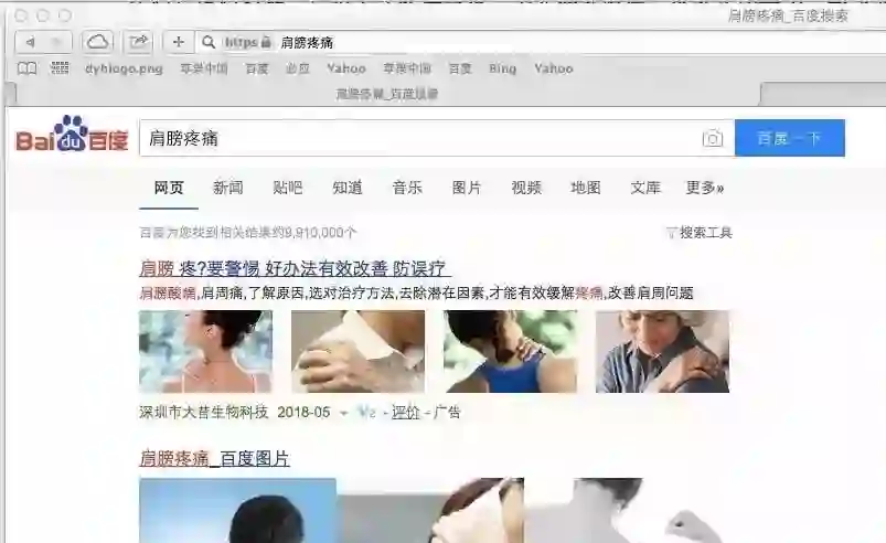 新京报记者在搜索中发现,部分关键词的商业推广信息条数明显超过这个比例。以“肩膀疼痛”为关键词,在首页的14项搜索结果中,有5项标有“广告”字样,显然超过30%的比例。以“胃疼”为关键词搜索时,虽然首页、第二页带有“广告”字样的推广内容均为4条,未超过30%,但在第3、4、5页,带有“广告”字样的推广内容均为5条。