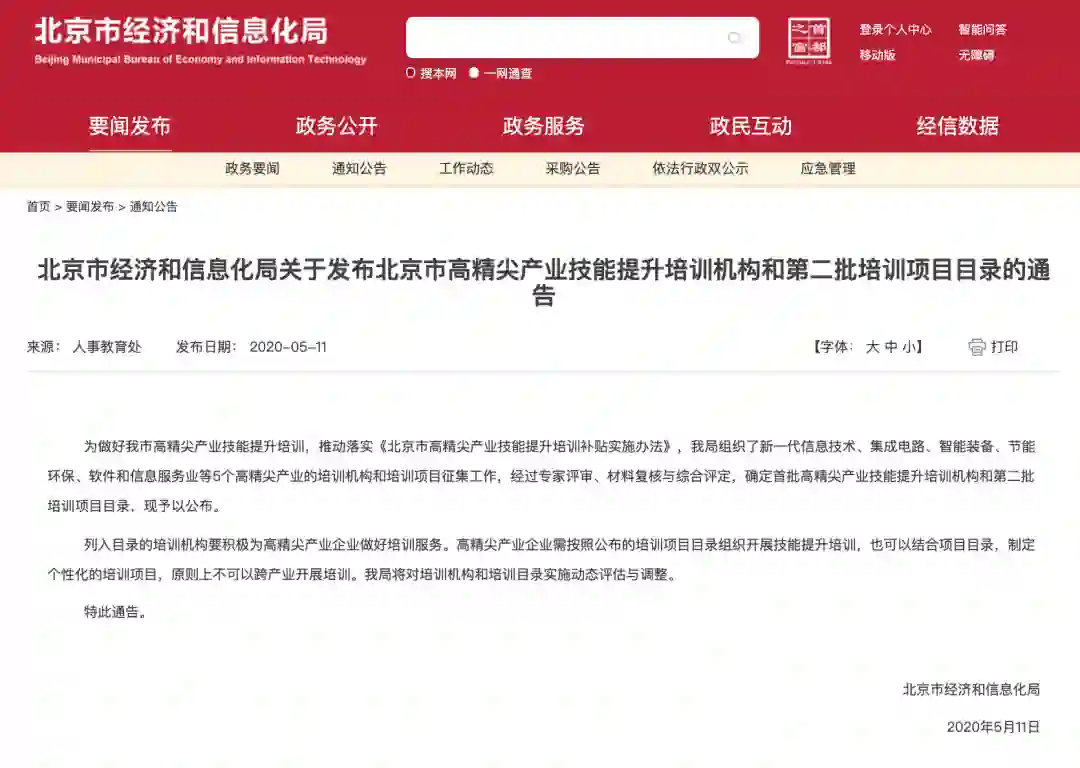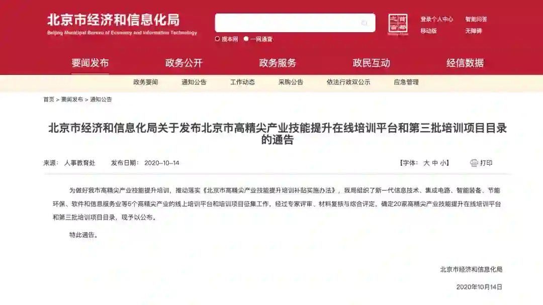 入选北京市高精尖产业技能提升在线培训平台 —— 北京市经济和信息化局