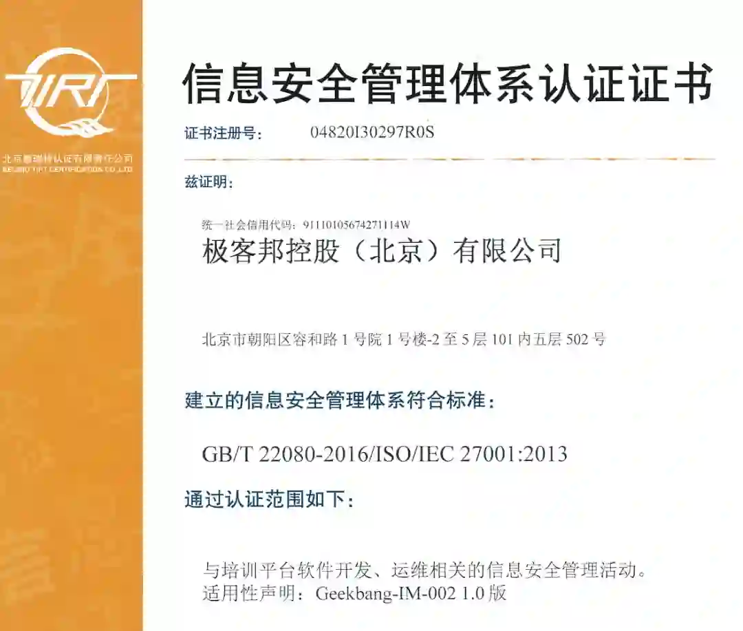 通过了ISO27001认证,代表极客邦科技在信息安全管理上,已建立了一套科学有效的管理体系作为保障。这是在世界上公认解决信息安全的有效方法之一。