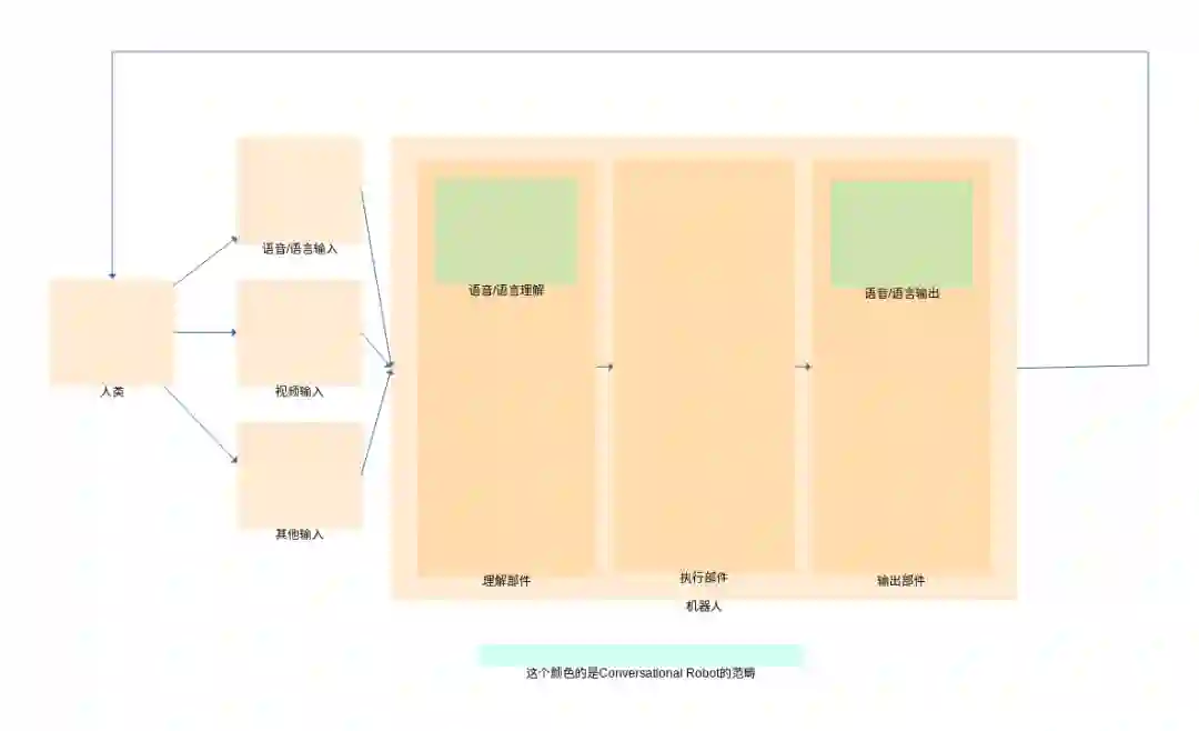 Conversational Robot 特指接受语言,或者经过转换的语音数据,根据对文本的理解,产生一些执行操作。执行操作可以由其他部件完成。最终把执行结果返回给人的这一个过程的相关部件。