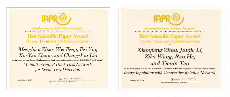 【导读】日前,国际模式识别大会(ICPR 2020)以线上形式召开,各奖项评选结果在大会中正式发布,自动化所共斩获大会五项最佳学术论文奖( Best Scientific Paper Award)中的两项。同时,大会也为入选IAPR Fellow的自动化所蒋田仔研究员、赫然研究员正式颁发证书。下面,将与各位分享此次获得ICPR最佳学术论文奖的两篇文章。