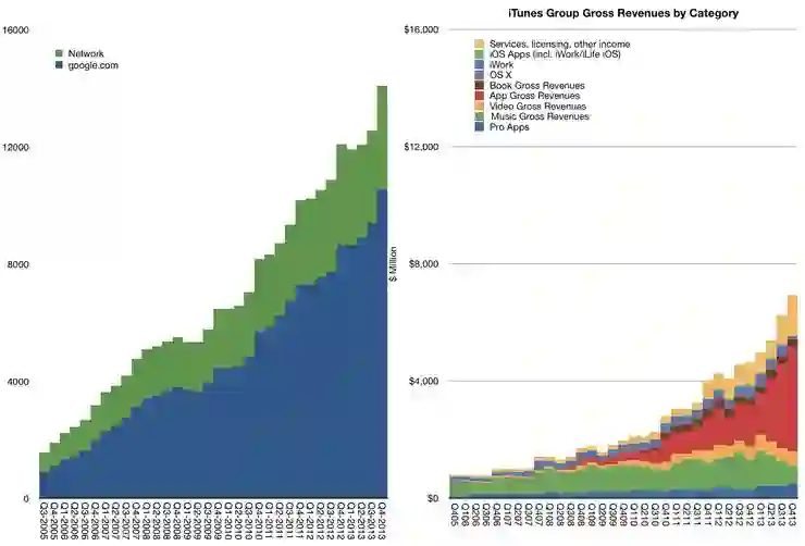 2014 年,“分析师之王”Horace Dediu 通过分析苹果的财报得出结论:苹果 iTunes 部门(包括 iTunes Store、App Store、Mac App Store、iBooks Store、AppleCare、授权许可以及其它方面)的收入,堪比美国财富 500 强当中第 130 名的公司; 营收规模相当于 Google 的一半。(如下图)