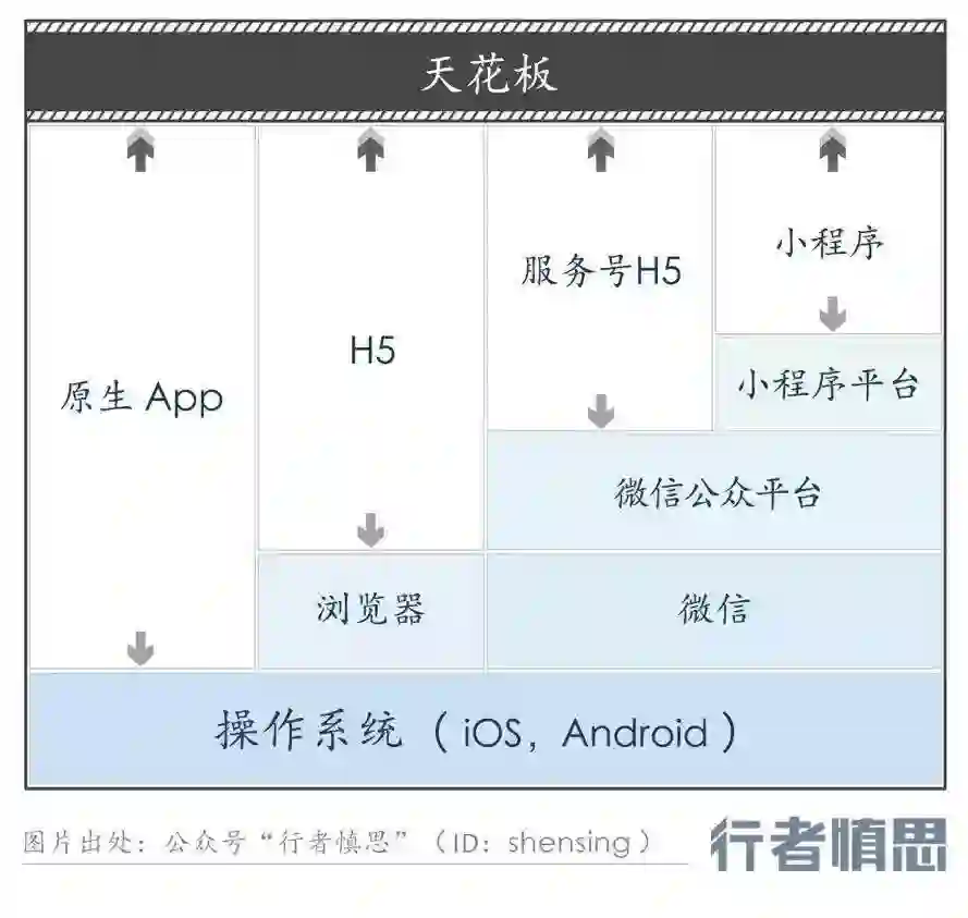 小程序又是建立在微信公众平台上面的,它一方面享受到公众平台的账户登录、客服通道,还能享受到小程序平台给出的更多原生接口。微信帮开发者把原生浏览器的重要功能提取出来,并封装到小程序里了,门槛低了,开发者就站在巨人的肩膀上,但它让天花板效应很明显。