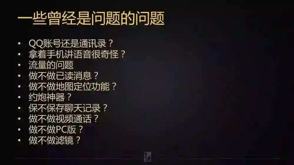 做不做 PC 版?微信大概到了 2013、2014 年才出现 Web 版。它的名字最早不叫 Web 微信,而是叫 “连接键盘”。在它的设计思想里面,电脑端只是帮你更方便打字的一个键盘而已。此外,网页、PC、Mac 版本全都不允许账号密码登录,因为微信账号体系背后有一个哲学:手机就是你,你就是手机,人在手机在,手机在人在。如果手机没了,聊天记录全部清空。如果微信允许 PC 端通过账号密码登录。用户离开电脑,有别人替代你收发微信,怎么办?