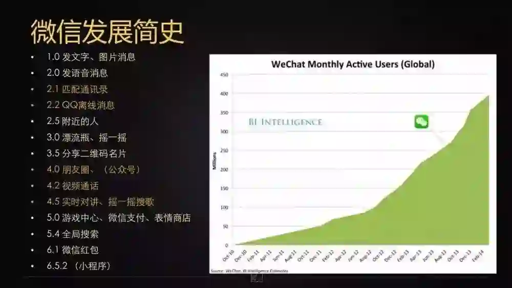 5.0 版本,微信加入了游戏中心、微信支付、表情商店。这三件事情的目标都是赚钱。5.4 版本微信开始支持全局搜索,6.1 版本微信红包诞生,6.5.2 版本小程序正式发布。