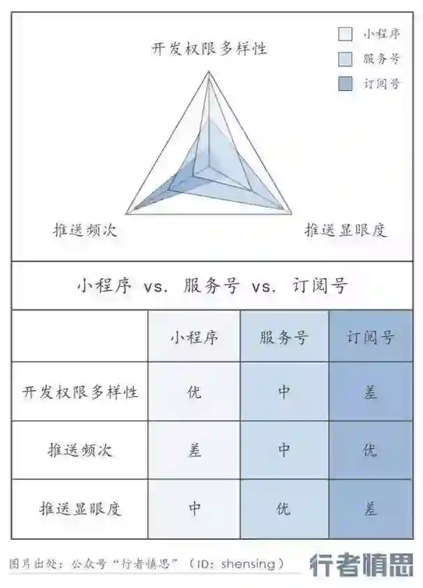 小程序、服务号、订阅号三者形成了矩阵。订阅号的推送功能最强,但小程序获得了开发权限的多样性。由微信定义的 “App”,可能就是若干个订阅号,一个服务号,一个小程序,基本就能满足创业者的需要。小程序左手赋能商家、右手提升用户体验,希望取得一个平衡。小程序可以让中国的大部分线下商业实现线上化。