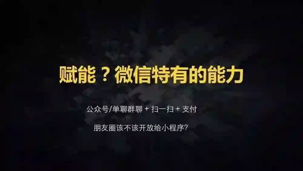 说到这里有一个问题,我不知道大家有没有想过:小程序不允许分享到朋友圈,既然要赋能,为什么不把朋友圈赋给我们呢?
