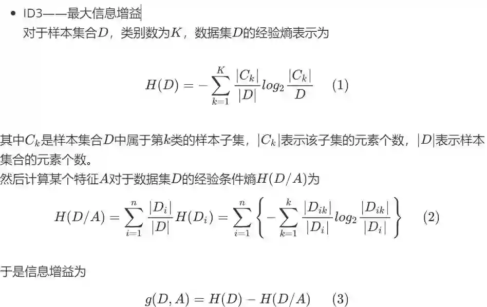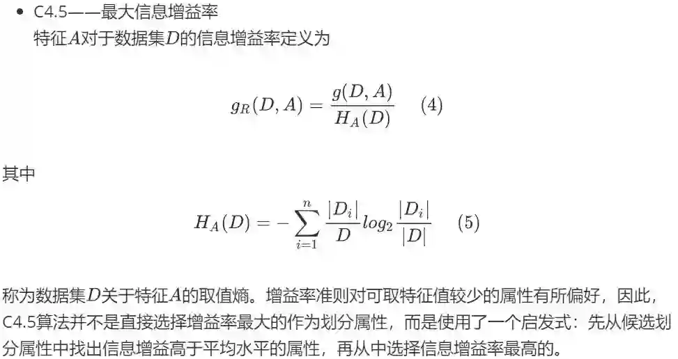 综上,ID3采用信息增益作为划分依据,会倾向于取值较多的特征,因为信息增益反映的是给定条件以后不确定性减少的程度,特征取值越多就意味着不确定性更高。C4.5对ID3进行优化,通过引入信息增益率,对特征取值较多的属性进行惩罚。