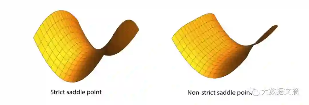 让我给你们看一张鞍点的图片。在左边我们有一个“严格”的鞍点。有一个负曲率的方向,这个负曲率是严格小于零的。在右边,它是个非严格鞍点,但第二个特征值严格为零。