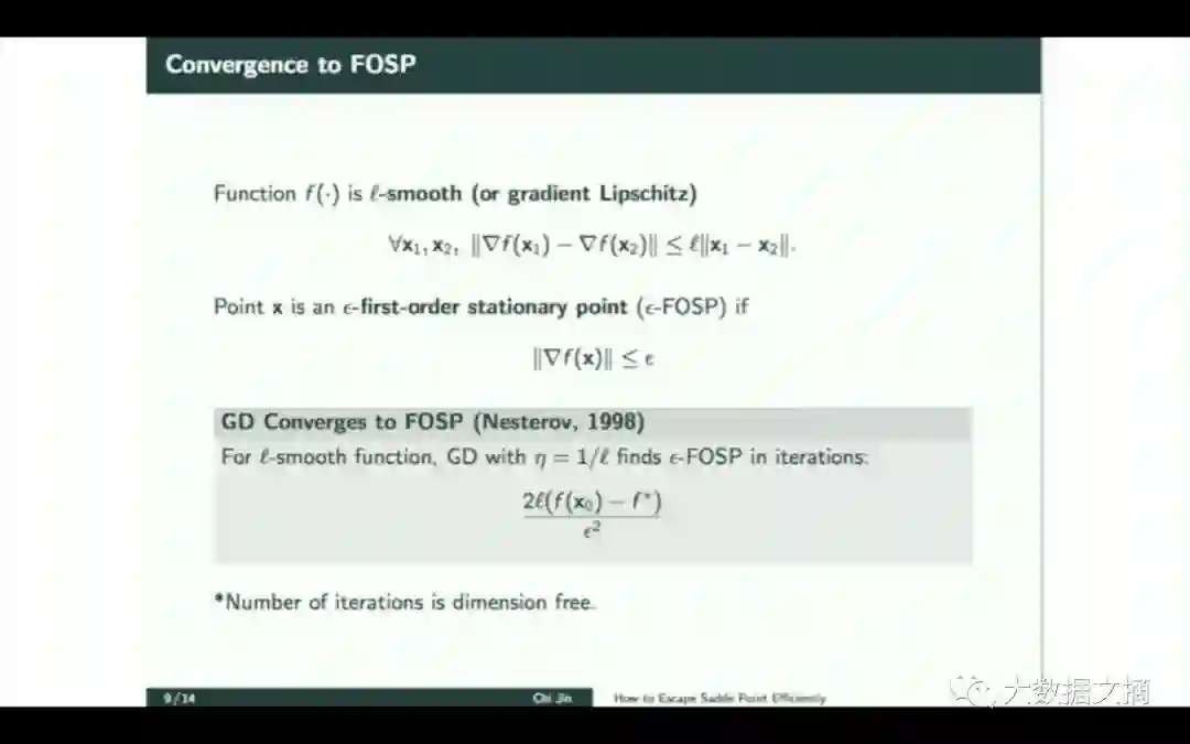 针对一个非凸的例子,我们不讨论最终值。我们将梯度设置为0,你可以证明你会得到一个驻点。但它可以是局部极小值或局部最大值或鞍点。当前最让我们困扰的是鞍点,我们到达和逃脱鞍点的速度。