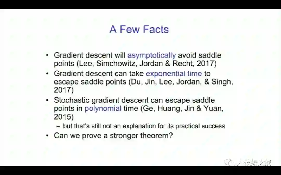 梯度下降可以用指数时间来逃离鞍点,这是另一个新结果。我们都喜欢随机评级,因为每次迭代都很简单。有一篇重要的论文证明在多项式时间内你会逃离鞍点,这是最近的工作。多项式级的复杂度是不好的。这对理论学家来说是好事,但这对实际的操作是不利的。所以这是一个开放问题,我们能否证明一个更强的定理,来理解为什么梯度下降通常是好用的。