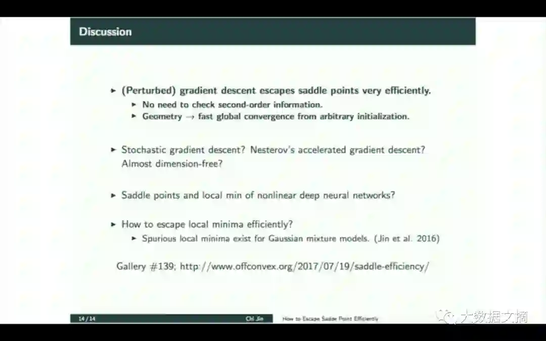 扰动梯度下降,它确实能够脱离鞍点,高效性只是它的一方面,所以这有些振奋人心,你不需要去计算二阶信息,所以我们这种基于梯度的方法是很优秀的。现在我们分析下扰动版本 ,如果你分析随机梯度会怎么样,你们对于加速算法以及诸如此类的算法有什么看法,如果你们希望了解更多的话,这里有一篇博客是我的学生Chi Jin和我在一周之前写的,你可以就此继续研究。非常感谢。