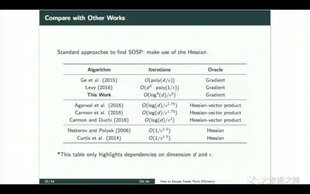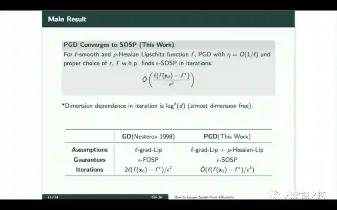 这是一个出人意料的结果。我们再来总结一下,这是经典梯度下降算法的研究成果,这是扰动梯度下降的结果,公式是一样的,这里我们没有写出那个关于d的对数的四次方的因子,现在我很怀疑四次方是不是最终的答案,我猜接下来的一两年里会取得新进展,使得对数的阶数降下来,达到一阶对数或者二阶对数,但是现在我们只能证明出对数的4次方这个结果。
